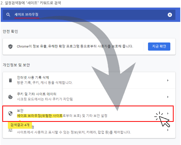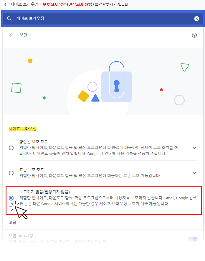설정 > 개인정보 및 보안 > 보안(세이프 브라우징) 해제(보호되지 않음(권장되지 않음)) 설정 후 이용을 해주시기 바랍니다.